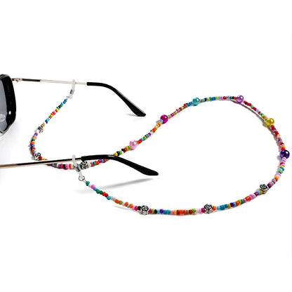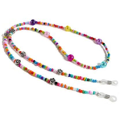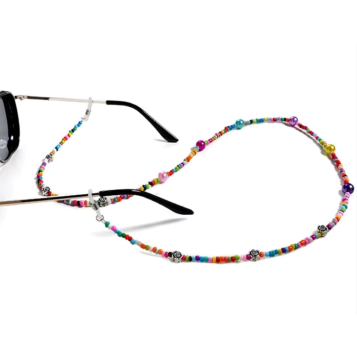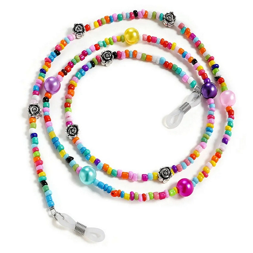 This 80cm reading glasses cord features a string of bright and colourful 3mm beads alternating with larger 6mm beads and silver flowerbud charms, all on a flexible nylon cord with adjustable rubber end loops to ensure a snug fit. A stylish, practical and eye-catching accessory.